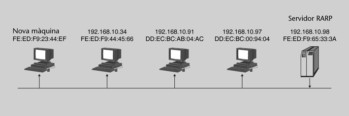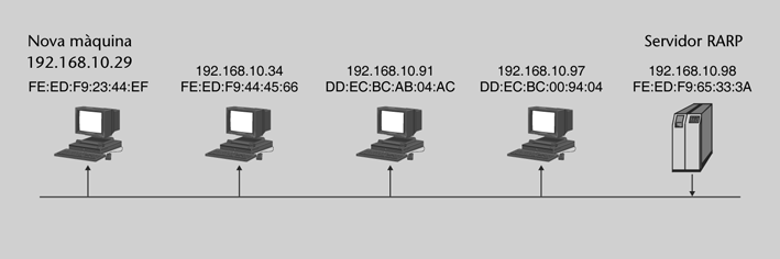 Totes les màquines ignoraran el paquet enviat excepte la màquina que s’ha connectat, que entendrà que el missatge és per a ella i se’l quedarà. En el moment en què la nova màquina accepti el paquet enviat pel servidor RARP, l’examinarà i n’extraurà l’adreça IP. En aquest moment, la nova màquina ja tindrà la seva pròpia adreça IP i, per tant, ja podrà començar a transmetre dades (figura).