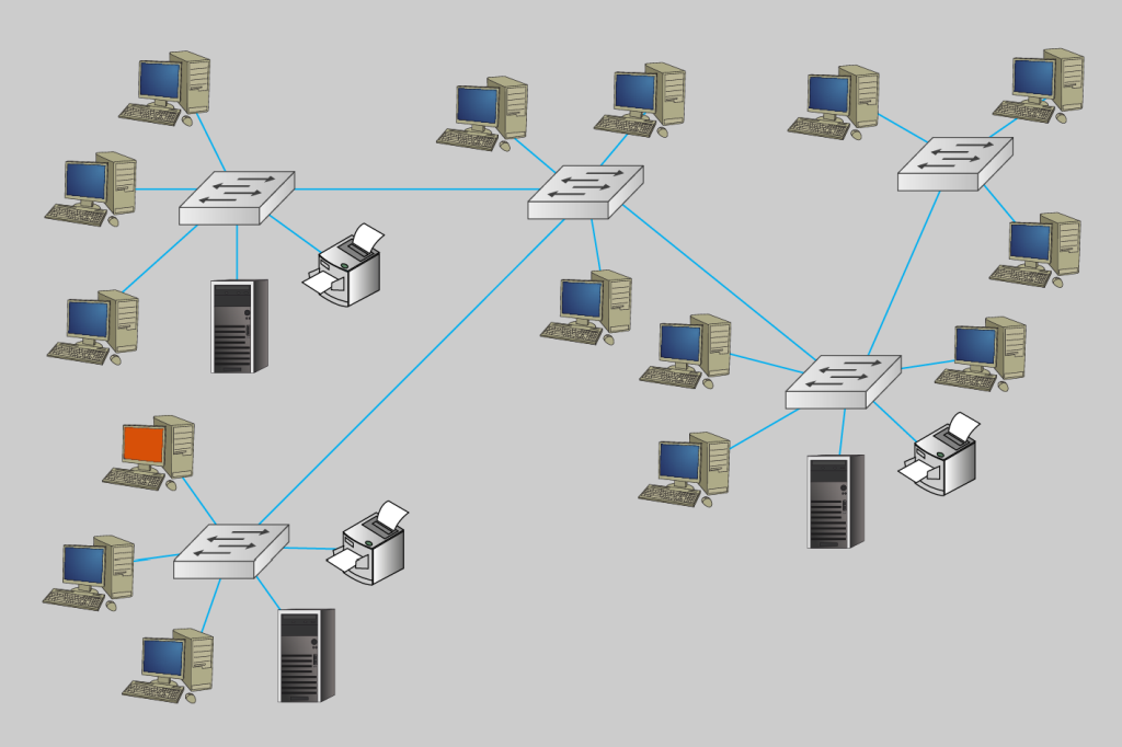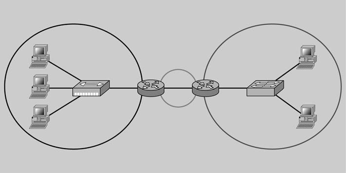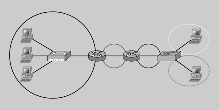 Tal com es veu en la figura, un domini de col·lisió broadcast (també anomenat domini de difusió) està constituït per tots els dispositius que estan connectats en una xarxa d’àrea local i que reben difusions de trames de dades enviades d’una màquina a totes les altres (trames broadcast). A grans trets, podem dir que un domini de col·lisió broadcast és un grup de dispositius de la xarxa que envien i reben missatges broadcast entre ells.