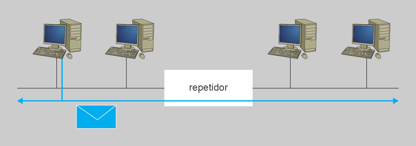 Els dispositius de capa 1 del model OSI (amplificadors i repetidors) no divideixen els dominis de col·lisió. Tot i que els dispositius no estan connectats físicament al mateix segment de cable, sí que estan connectats lògicament. Penseu que un amplificador i un repetidor retransmeten les trames per tots els segments on són connectats, per tant, les trames dels hosts col·lisionaran si aquests estan connectats a segments diferents per aquests dispositius de capa 1, com es pot veure en la figura.