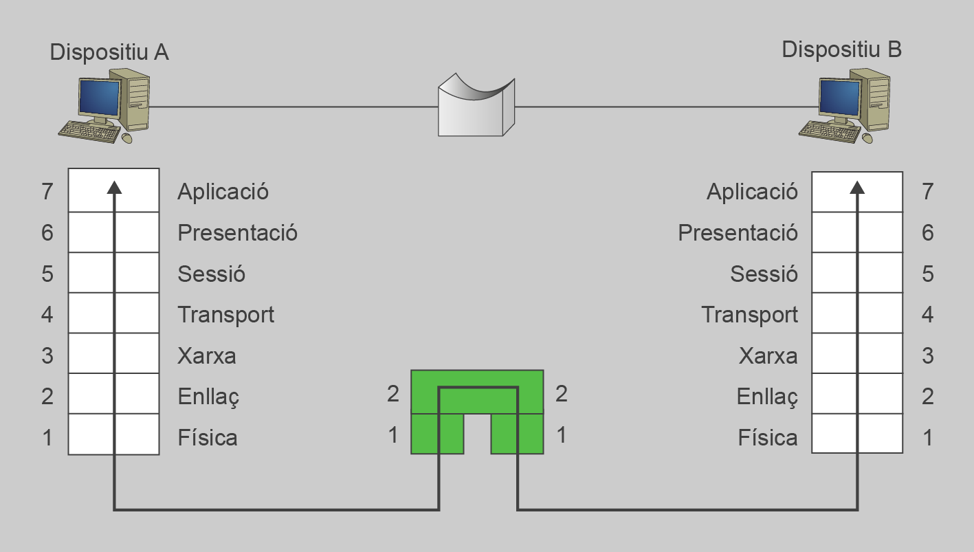 Els ponts i commutadors són dispositius de comunicació de dades que funcionen a la capa 2 del model de referència OSI. Per aquest motiu, se’ls coneix sovint com a dispositius d’enllaç de dades.