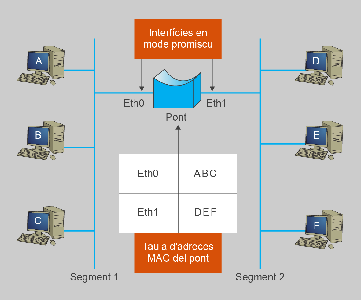 - Pont. Hem dit que els ports del pont funcionen en mode promiscu, per tant, tracten totes les trames que escolten del mitjà, independentment de si l’adreça MAC de destinació és la seva o no. El pont fa dues coses: