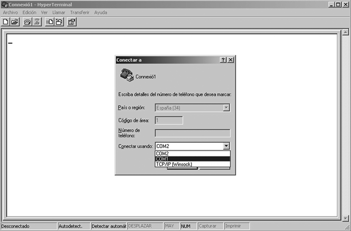 - Connectar un PC al port de consola del commutador i executar una emulació de terminal (amb hyperterminal o minicom) amb les dades següents: