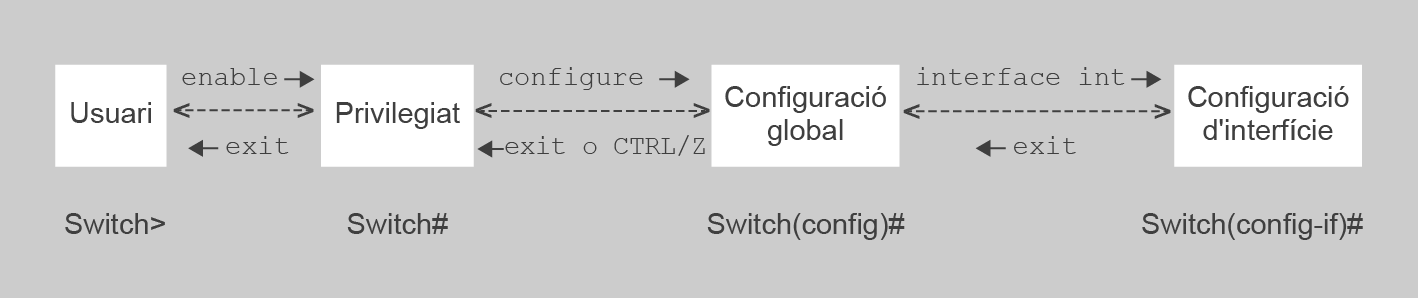 Per accedir al mode de configuració d’interfícies s’ha d’introduir des del mode de configuració global l’ordre interface nom_de_la_interfície: