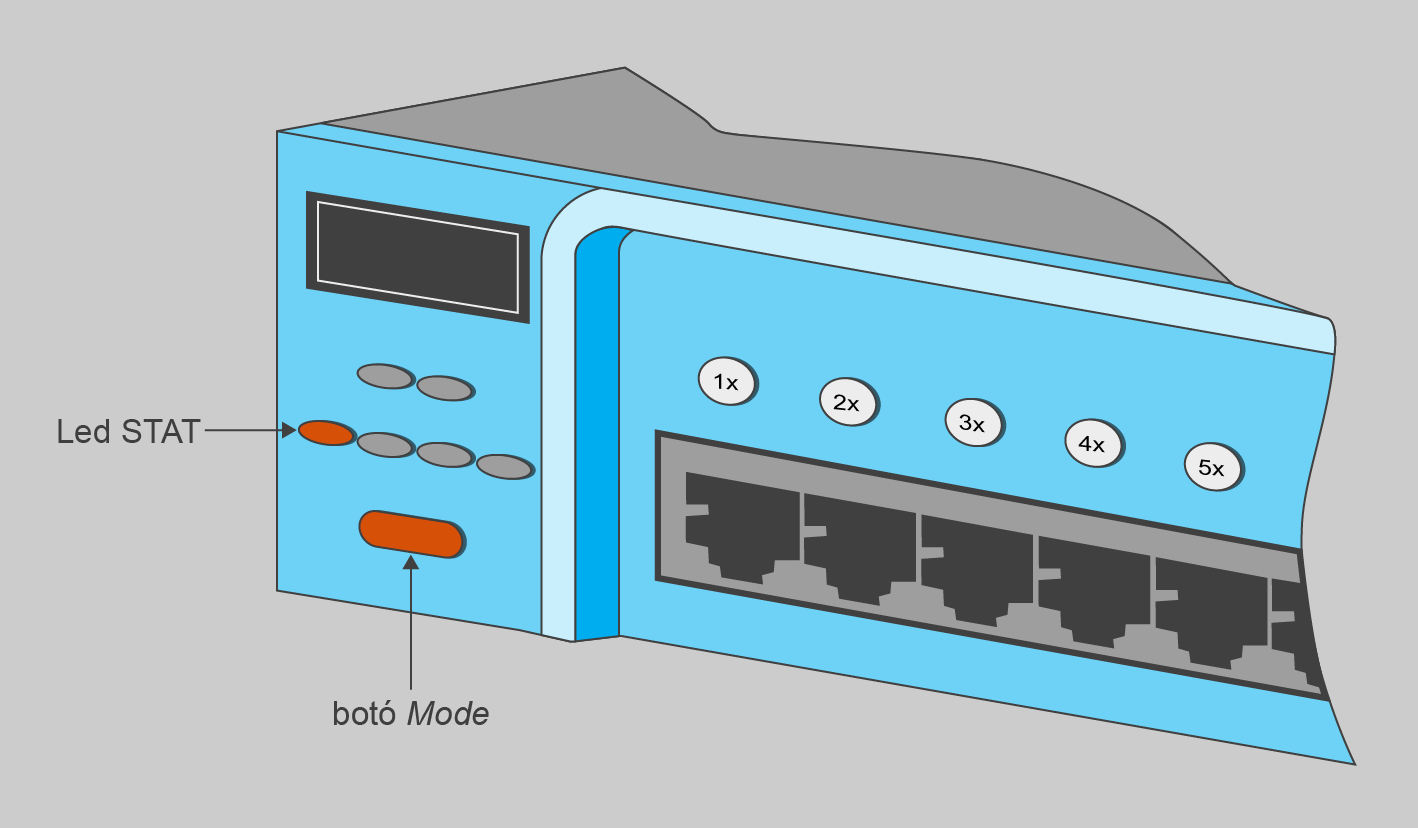 - Connectar el commutador al corrent elèctric de nou. S’ha de prémer el botó Mode, que és en la part esquerra del frontal del commutador (el podeu veure en la figura), mentre es torna a endollar el commutador al corrent.