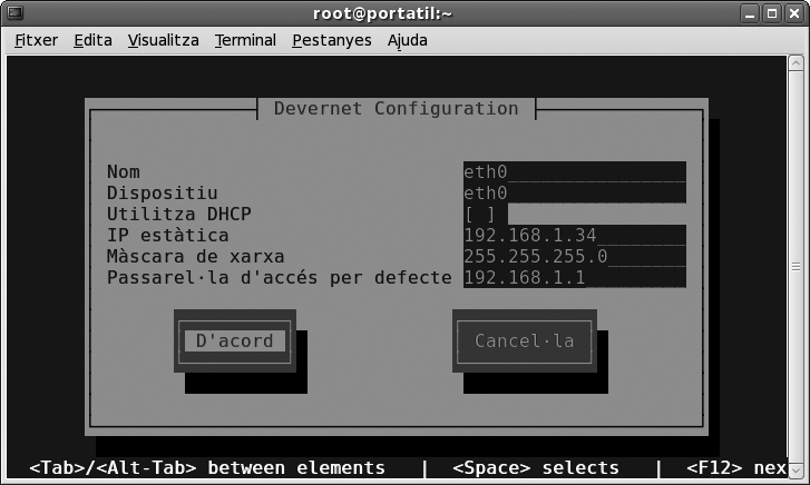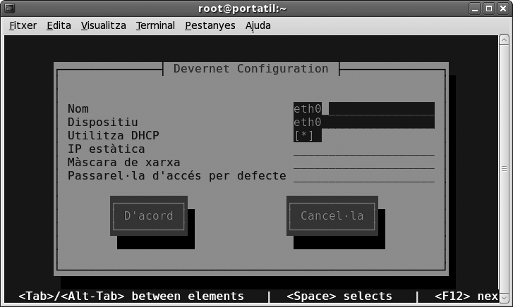 El procediment per activar el client de xarxa DHCP és molt senzill. N’hi ha prou d’activar l’opció pertinent, tal com mostra la figura (“Activació del client DHCP usant menús de text”).