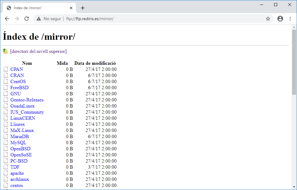 La figura mostra un exemple de mirall (mirror) de descàrregues per FTP per a diferents distribucions de Linux. Els usuaris poden descarregar-se sistemes operatius usant un client navegador qualsevol, com Firefox o Chrome.