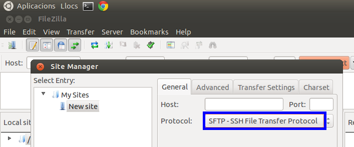 En el cas de voler-se connectar amb un client gràfic com, per exemple, FileZilla, també cal indicar que s’usa SFTP, tal com es pot veure en la figura: