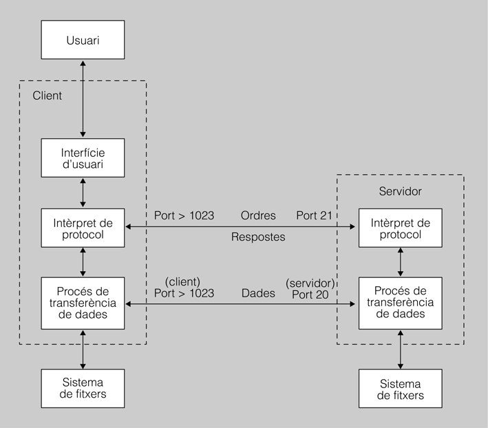- Transferència de dades: és la part encarregada d’intercanviar els fitxers i directoris entre client i servidor. En el funcionament bàsic, el canal de dades s’estableix entre un nou port del client (port dinàmic i específic per a la transmissió del fitxer) i el port 20 (ftp-data) del servidor.