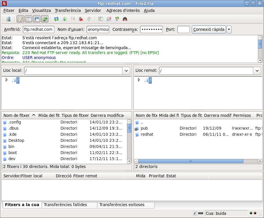 [pere@host ~]# ftp localhost Name (localhost:root): pere Password: ftp> pwd 257 "/home/pere" ftp> ls -rw-rw-r-- 1 500 501 70 Jun 01 17:14 pere.info ftp> cd /tmp ftp> ls -rw-rw-rw- 1 0 0 1695 Jun 01 17:15 fitxa.odt ftp> !pwd /root ftp> get fitxa.odt local: fitxa.odt remote: fitxa.odt ftp> cd ~ 250 Directory successfully changed. ftp> pwd 257 "/home/pere" ftp> !pwd /root ftp> get pere.info local: pere.info remote: pere.info ftp> put fitxa.odt nou.odt local: fitxa.odt remote: nou.odt ftp> put pere.info /tmp/pere.txt local: pere.info remote: /tmp/pere.txt ftp> cd pub ftp> put pere.info local: pere.info remote: pere.info 553 Could not create file. ftp> bye 221 Goodbye.