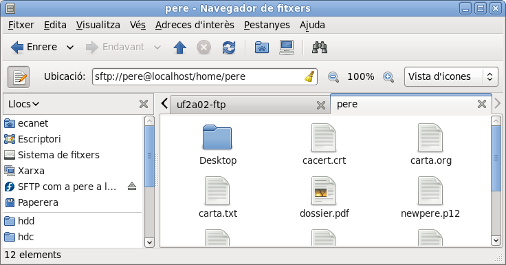 root@server:/# sftp pere@localhost Connecting to localhost... pere@localhost's password: sftp> pwd Remote working directory: /home/pere sftp> ls nou.odt pere.info sftp> put pere.info /tmp/pere.bak Uploading pere.info to /tmp/pere.bak pere.info 100% 70 0.1KB/s 00:00 sftp> get /tmp/pere.bak Fetching /tmp/pere.bak to pere.bak /tmp/pere.bak 100% 70 0.1KB/s 00:00