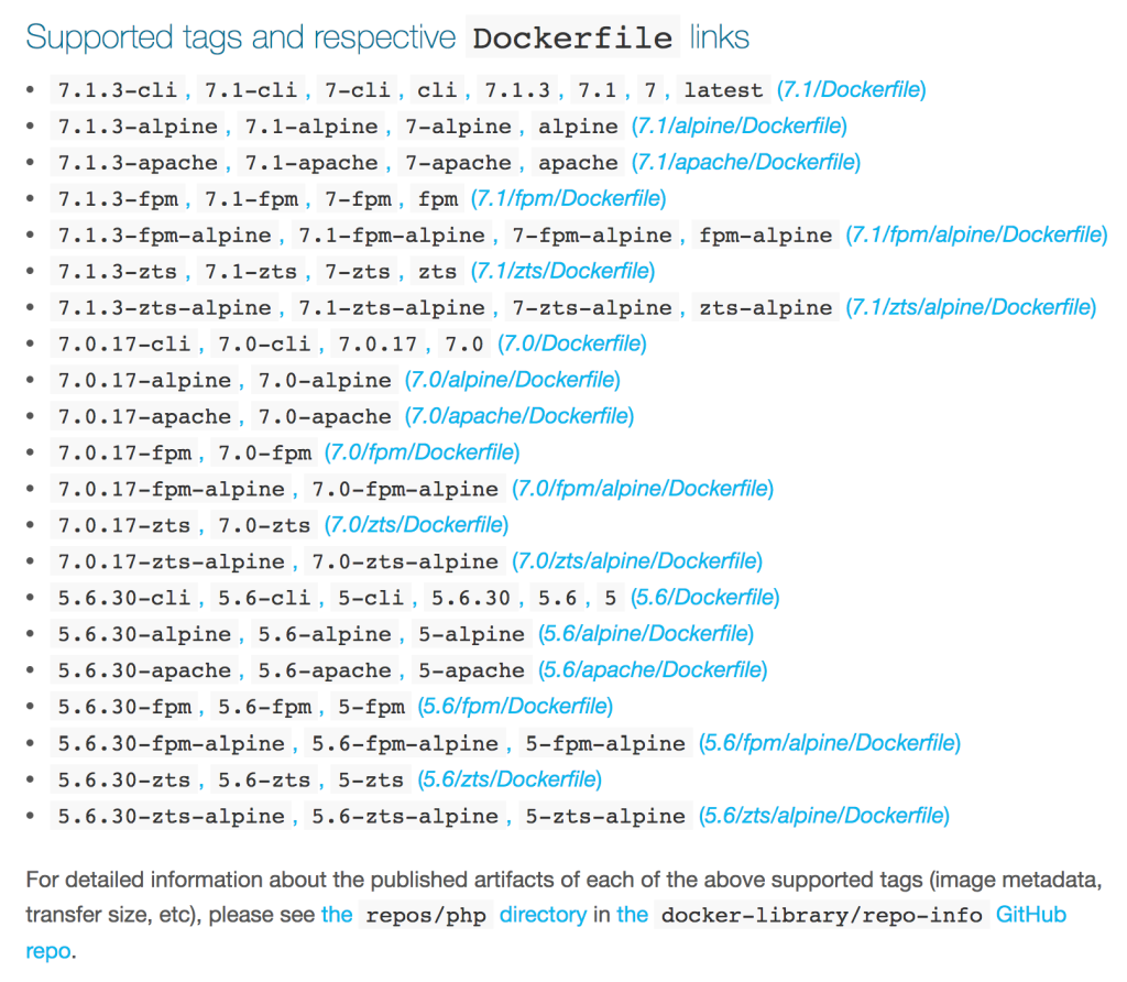L’enllaç a la imatge de Docker oficial per a PHP es troba a l’enllaç següent: hub.docker.com/_/php/. Al principi de la pàgina hi ha la llista d’imatges disponibles (vegeu la figura).
