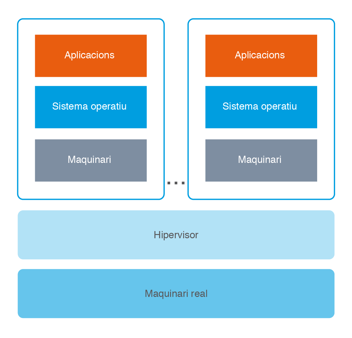 No obstant això, l’ús principal de la virtualització és la creació de múltiples ordinadors o servidors completament independents, coneguts com a màquines virtuals, en un sol ordinador físic. Tot i que les màquines treballen de forma independent, comparteixen els mateixos recursos de maquinari (processador, memòria, disc dur i interfícies de xarxa). Això és possible gràcies a l’hipervisor, també anomenat monitor de les màquines virtuals o VMM (de l’anglès Virtual Machine Monitor), que és el programa que arbitra i gestiona dinàmicament aquests recursos entre totes les màquines virtuals.