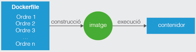 Els contenidors de Docker són instàncies d’una imatge que conté tots els fitxers necessaris empaquetats per crear el contenidor en un sol fitxer. Al seu torn, aquesta imatge és construïda a partir d’un fitxer anomenat Dockerfile, que conté totes les ordres necessàries per assemblar-la (vegeu la figura).