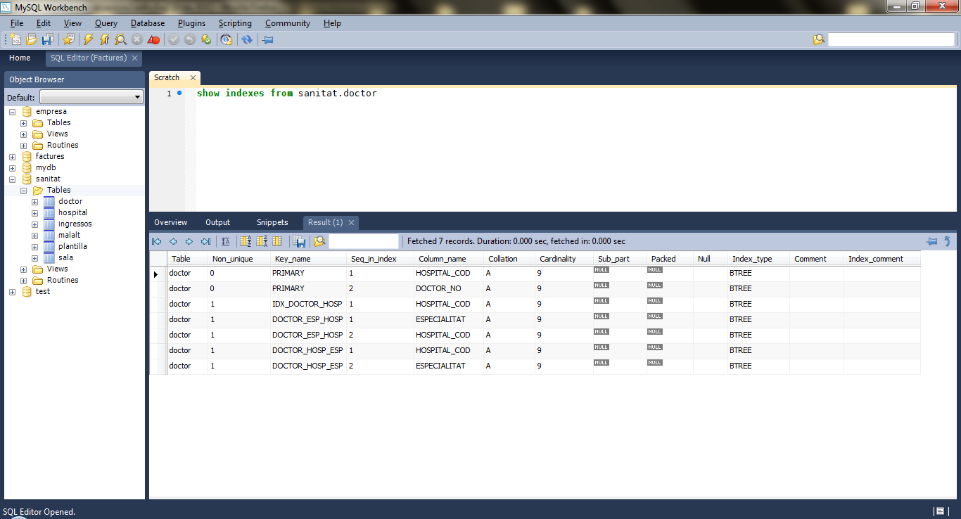 En el cas de la taula doctor de l’esquema sanitat, podem observar el resultat visualitzat en l’eina Workbench de MySQL, en la figura.