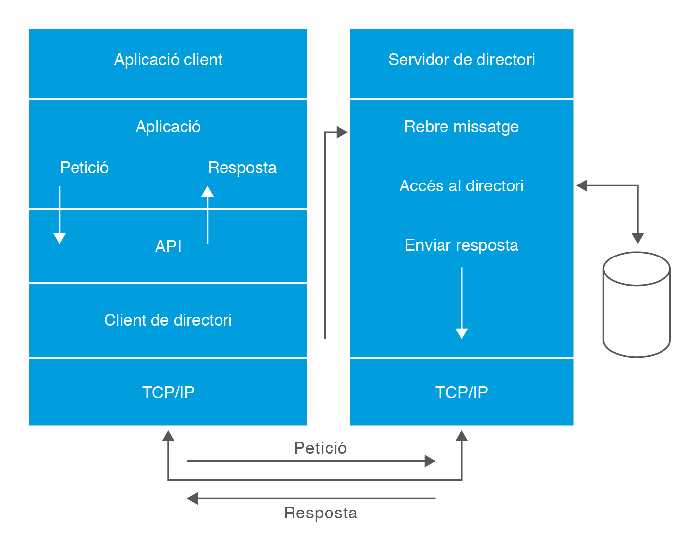 Els serveis de directori solen implementar-se seguint el model client-servidor, de manera que una aplicació que vol accedir al directori no accedeix directament a la base de dades, sinó que, tal com mostra la figura, crida a una funció de l’API (Application Programming Interface) proporcionada pel servei, que envia un missatge a un procés del servidor. Aquest procés accedeix al directori i retorna el resultat de l’operació.