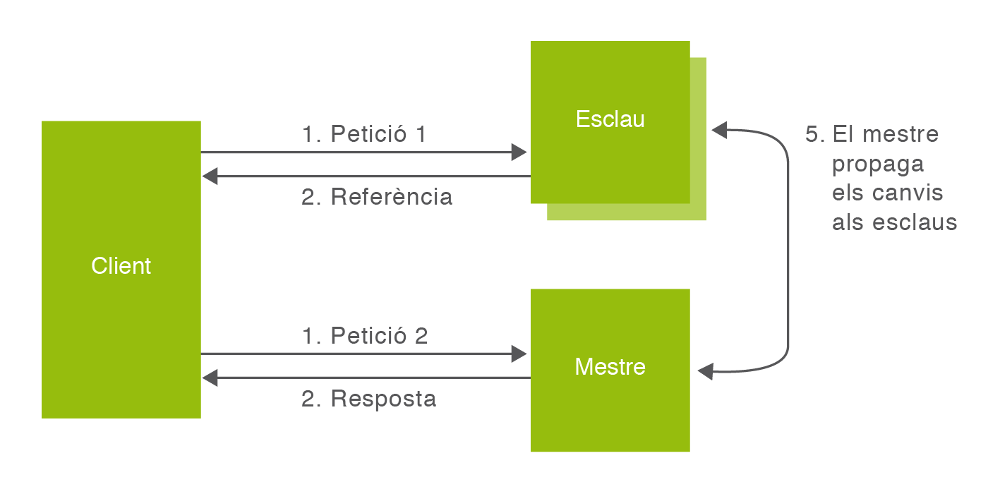 A més de la configuració mestre-esclau com la que mostra la figura, hi ha implementacions amb replicació multimestre (les actualitzacions es repliquen a diversos nodes que poden actuar com a mestre).