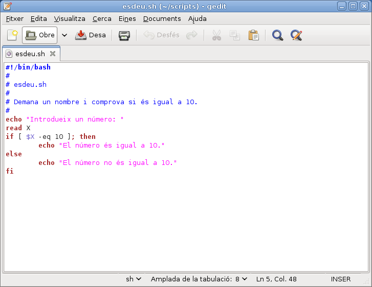 Els editors de texts plans es distingeixen dels processadors de textos en que es fan servir per escriure només text, sense format i sense imatges, és a dir sense diagramació. També podem optar per fer servir un editor de text avançat que reconegui el llenguatge del shell i utilitzi diferents colors per al ressaltat de la sintaxi, com el de la figura. Aquesta mena d’editors són especialment útils quan som principiants, ja que ens ajuden a prevenir errors de sintaxi, com ara oblidar de posar una clau de tancament, unes cometes dobles, etc.