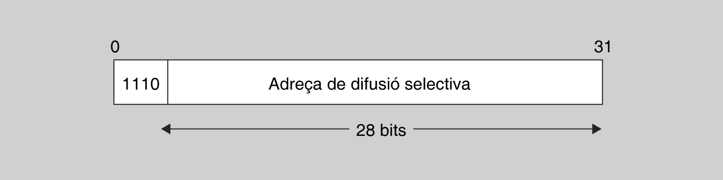 * Adreça de classe D. Les adreces de classe D es van crear per permetre la difusió selectiva (multicast) en una adreça IP. De fet, aquest tipus d’adreça es pot diferenciar de les altres gràcies als quatre bits de més pes, que en una adreça d’aquesta classe valen sempre 1110 (figura). De fet, són adreces de xarxa que comencen en el nombre 224.0.0.0 i acaben en el nombre 239.255.255.255. Aquesta adreça utilitza els 28 bits restants com a adreça de difusió selectiva.