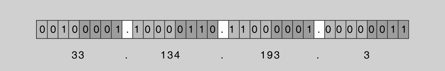 Tal com mostra la figura, l’adreça IP es compon de 4 octets, això és, agrupaments de 8 bits, expressats en numeració decimal (valors de 0 a 256) i separats per punts.