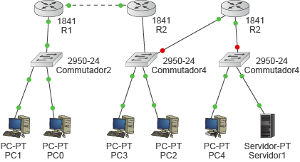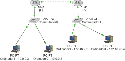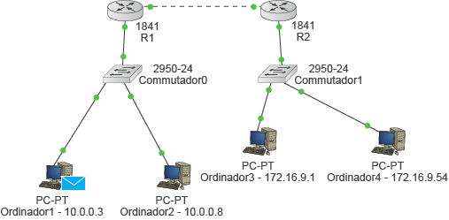 - La xarxa B, composta per dos ordinadors (PC3 i PC4), un commutador (SW2) i dos encaminadors (R2 i R3).