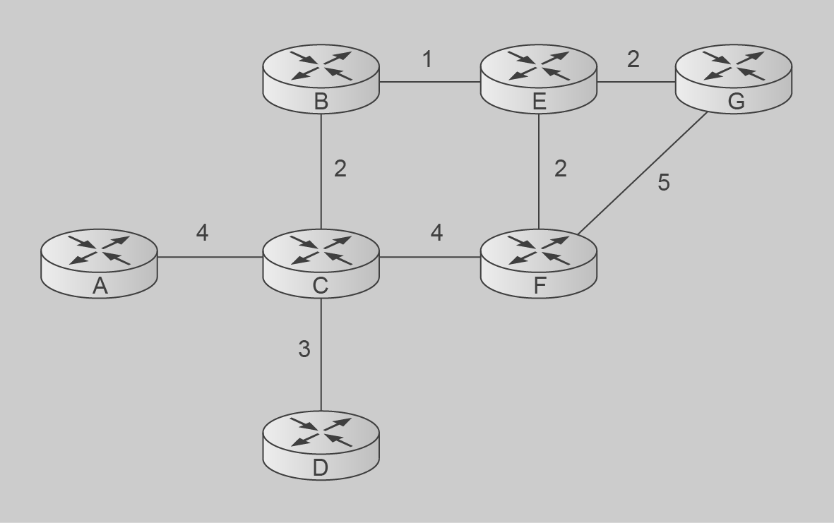 Al començament de l’algorisme, l’encaminador A únicament sap el cost d’arribar a C amb cost 4. Quan rebi el vector distància dels seus veïns (en aquest cas, C) rebrà la informació del cost d’arribar als veïns de C. El vector distància de C serà el que es veu en la taula.