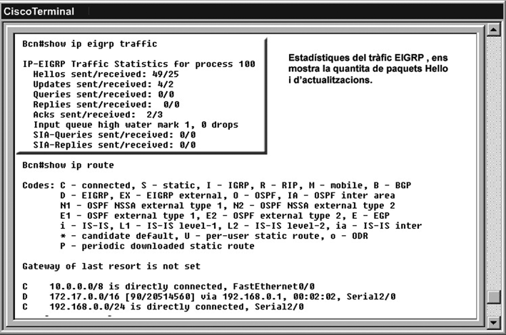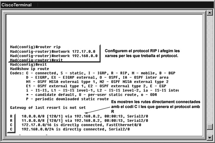 Fixeu-vos que s’ha configurat com encaminador d’últim recurs (gateway last resort) 192.168.10.1 que és justament l’interfície de l’encaminador R0. La ruta per defecte té el codi adicional E2,