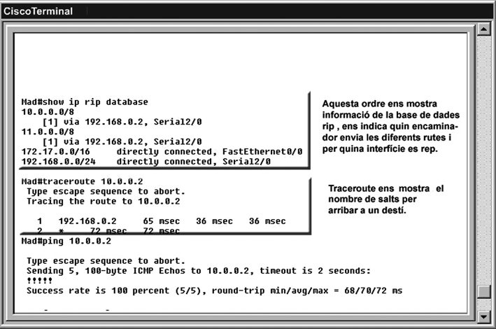 Podeu comprovar que totes les rutes segueixen els camins esperats. Fixeu-vos que les entrades de la taula creades per OSPF tenen una O al començament de línia. Si analitzem les línies del resultat de l’ordre: