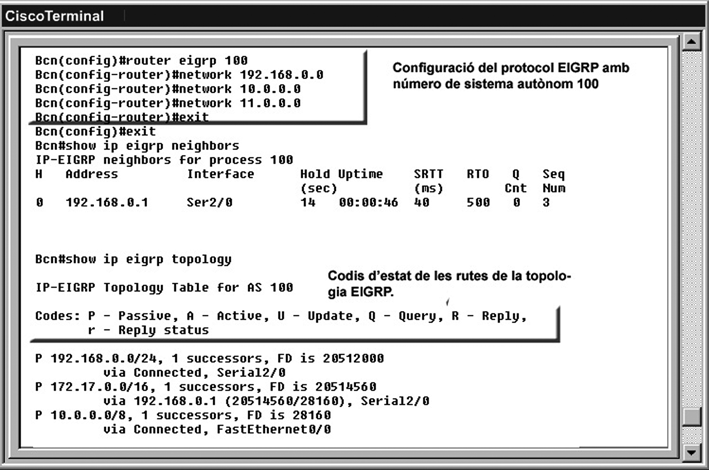 - EIGRP (enhanced interior gateway routing protocol, protocol millorat d’encaminament interior a l’encaminador). Aquest protocol aporta optimitzacions importants a l’IGRP, per minimitzar la inestabilitat de les rutes quan canvia la topologia i també respecte a l’amplada de banda i el consum del processador dels encaminadors que fa servir el protocol.