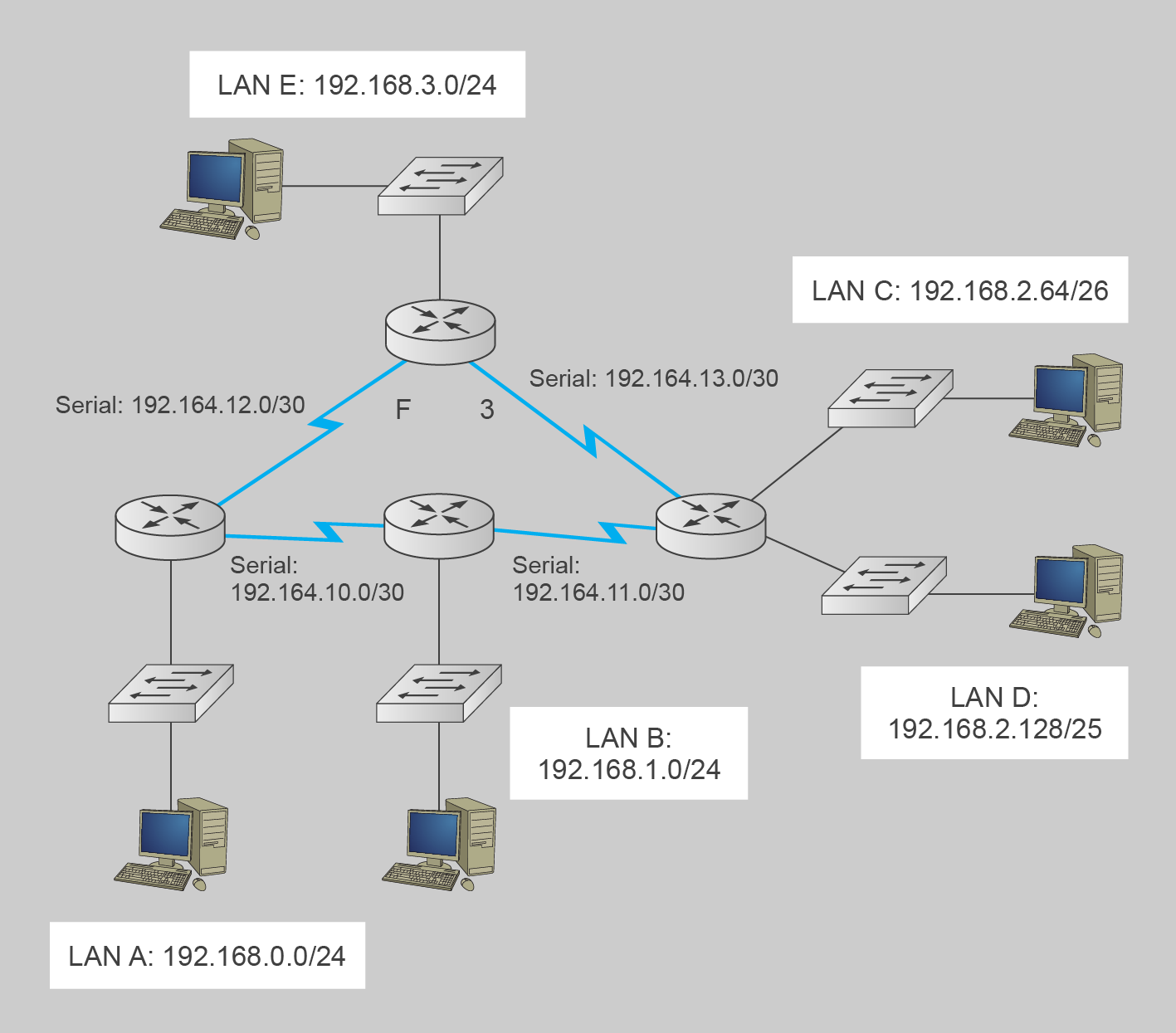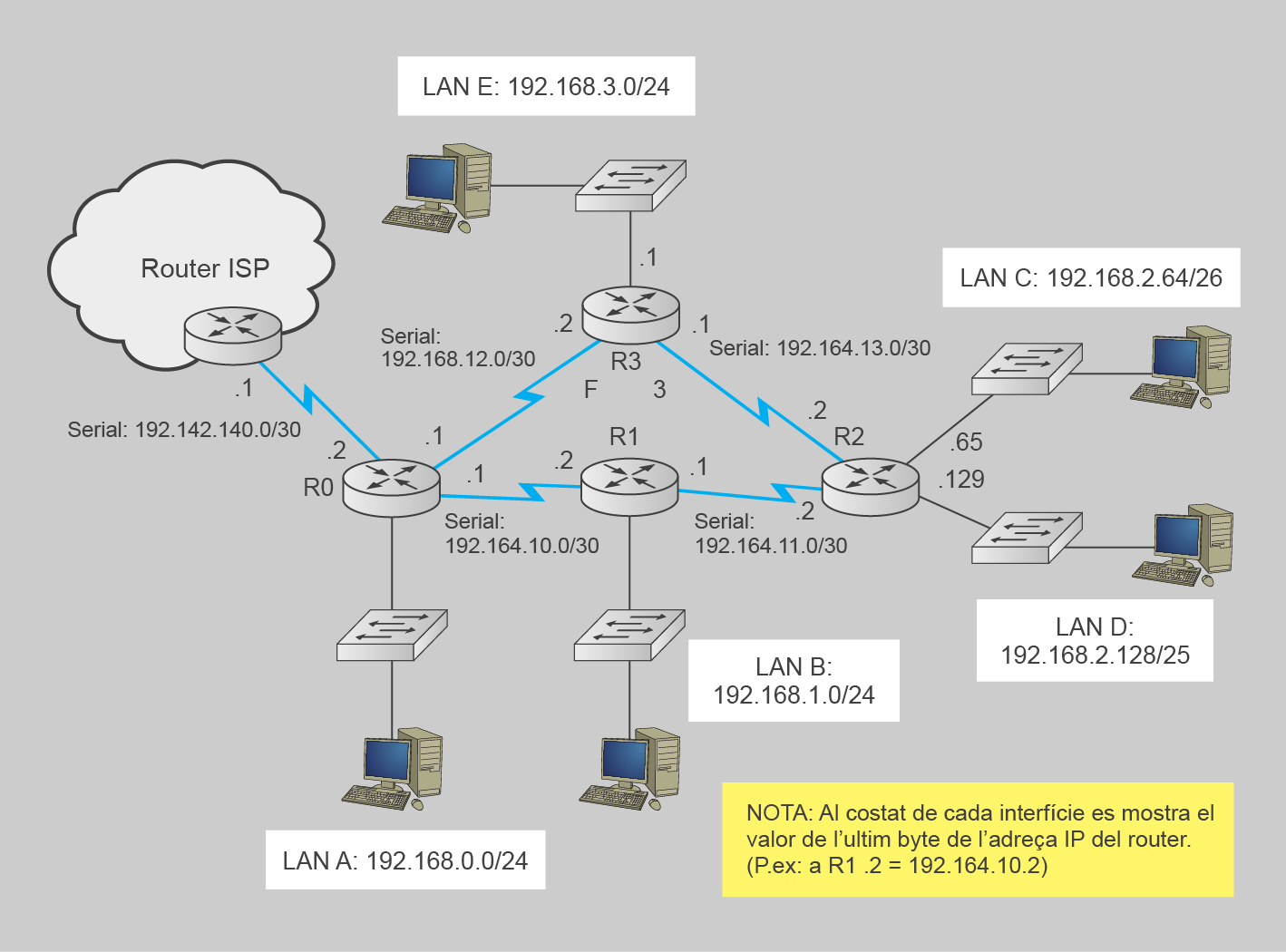 - 192.168.2.0/24 té dues subxarxes (ha fet agregació de xarxes) que són 192.168.2.64/26 i 192.168.2.128/25. Es poden accedir o bé, per 192.168.12.2 (a través de la interfície Serial0/1/1) o, per 192.168.10.2 (a través de la interfície Serial0/1/0).