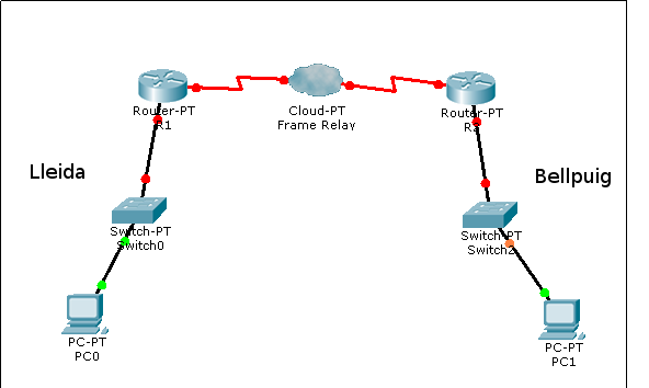 Hi ha dues xarxes locals separades físicament, ja que són a dues ciutats diferents: a Bellpuig i a Lleida. Aquestes les volen connectar entre elles -vegeu l’esquema. Per fer-ho la companyia de telecomunicacions ha posat a la vostra disposició un enllaç frame relay i l’ha enllaçat als vostres encaminadors mitjançant un cable en sèrie. La vostra feina és configurar correctament els dos encaminadors i els dos ordinadors per garantir la connexió entre les dues xarxes locals.