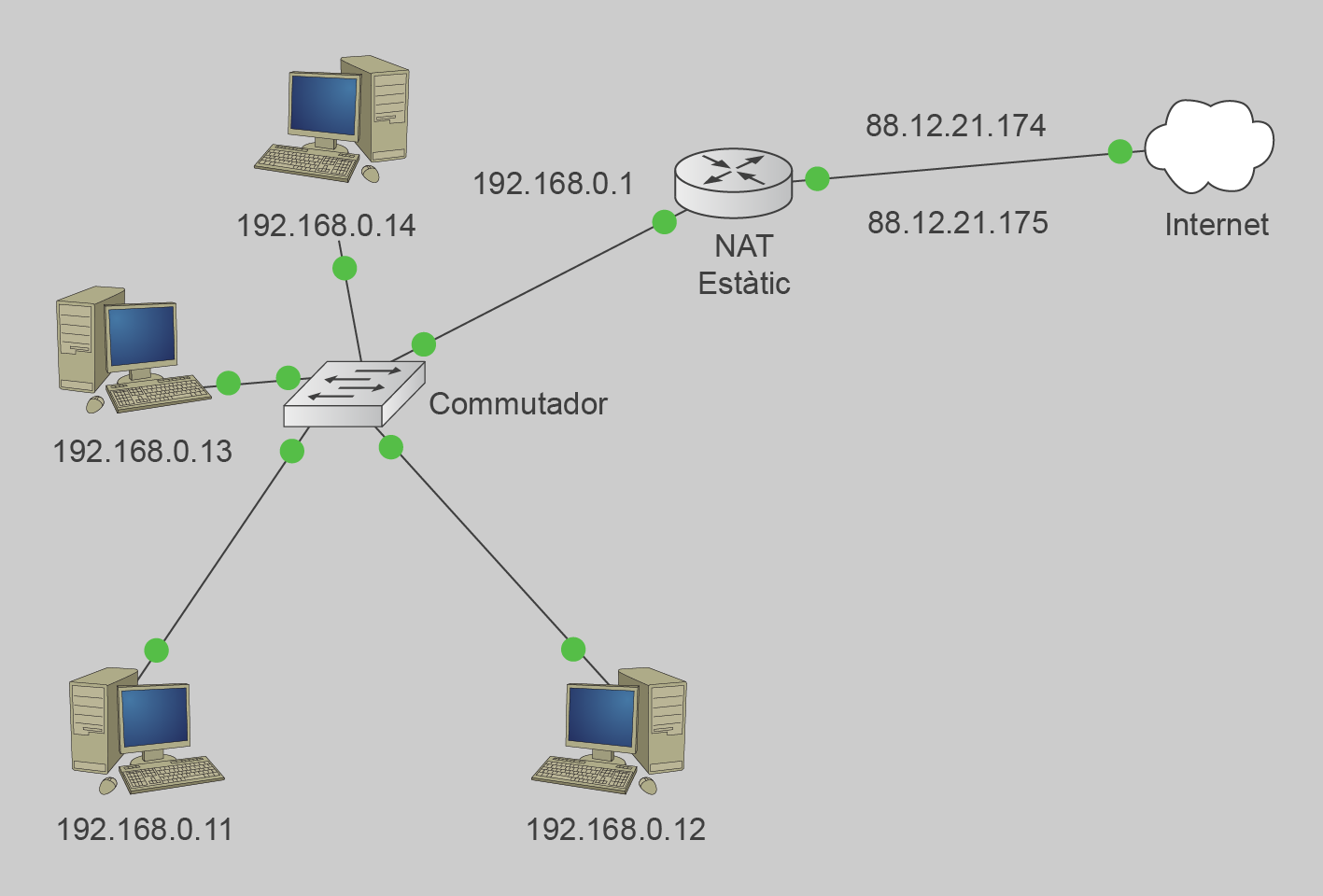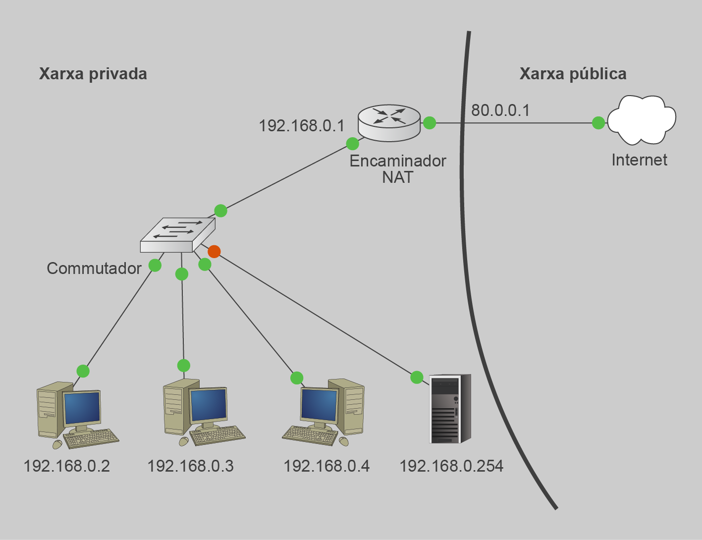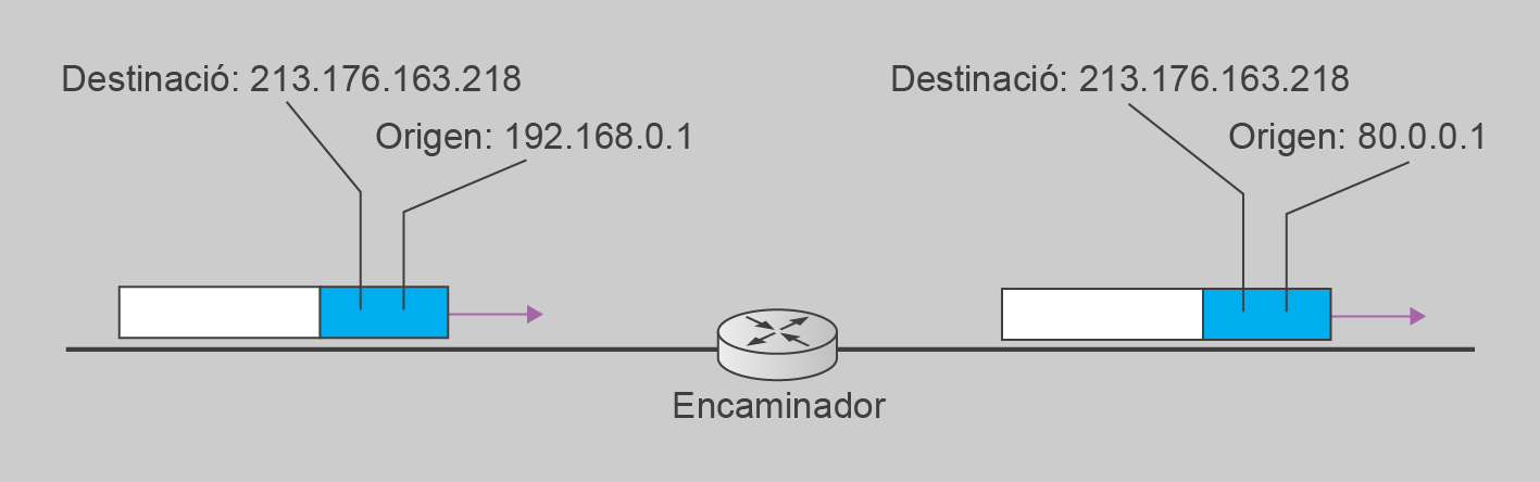 En la figura podeu observar que a tots els ordinadors de la xarxa privada correspon una adreça privada de classe C, però a Internet tots s’identifiquen per la mateixa adreça. És en aquest cas que l’encaminador ha d’efectuar la traducció d’adreces.