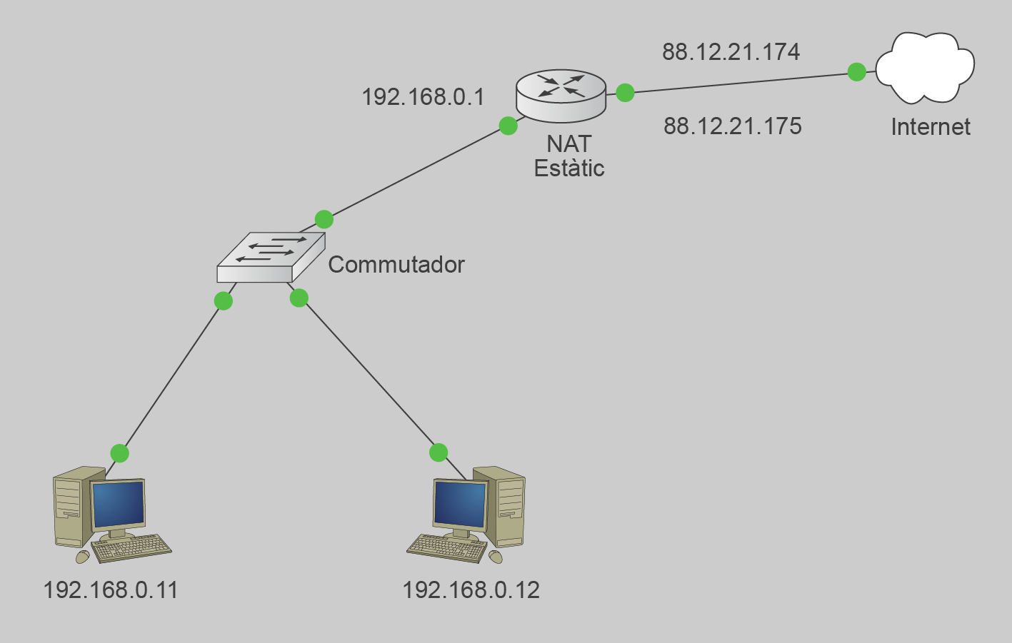 Vegeu en la figura una xarxa domèstica amb dos ordinadors. En aquesta figura es vol donar accés a Internet als dos ordinadors. En aquest cas disposeu de dues adreces públiques i, per tant, s’escau implementar-hi aquest tipus. Per fer-ho tan sols heu de decidir quina adreça pública assignareu a cada ordinador. Podríeu triar la que proposa la taula.