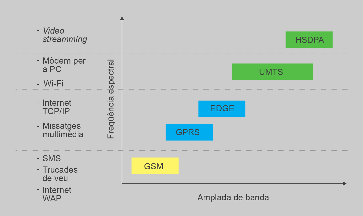 L’aparició de la tecnologia UMTS provoca un salt qualitatiu en la comunicació mòbil. Podeu veure representada aquesta millora en les característiques següents: