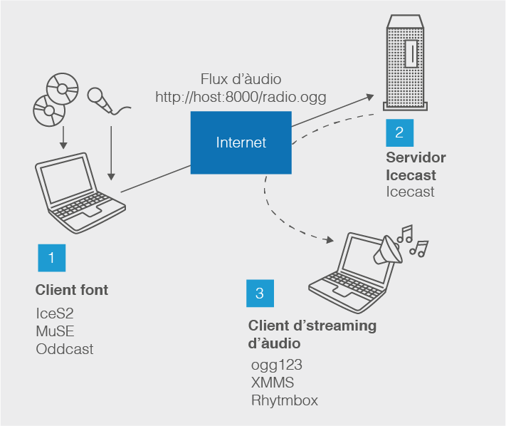 - Client font. A través de diferents programaris (IceS, Ezstream, etc.) s’envia l’stream d’àudio cap al servidor per tal que sigui reemès posteriorment per la xarxa a través d’IceCast.