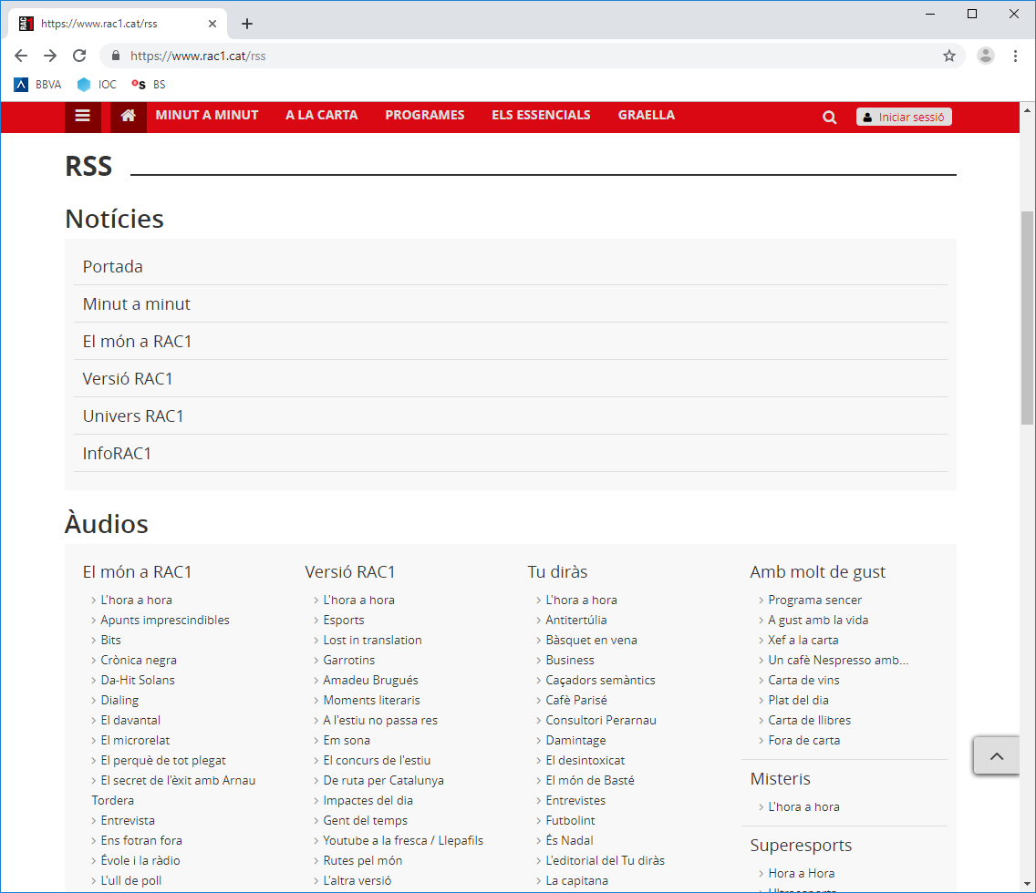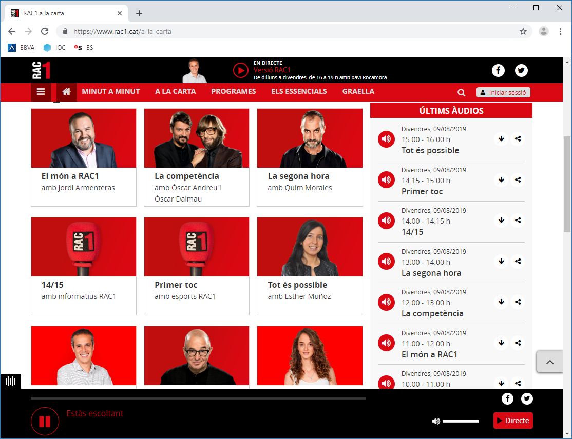 En la figura podeu veure les opcions en una ràdio comercial. A baix de tot es pot escoltar la ràdio en directe, i a la columna de la dreta es pot escoltar la ràdio a la carta o baixar el programa per escoltar-lo més endavant.