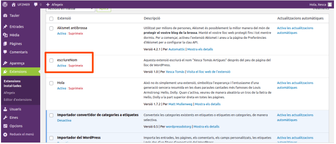 Un cop hem creat el fitxer o fitxers d’una extensió i els hem guardat en el directori plugins de wp-content d’un lloc de WordPress, apareixerà en el llistat d’extensions del lloc. En la figura podem veure com apareix l’extensió escriureNom que hem creat, en el llistat d’extensions: