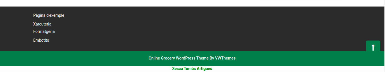Per executar l’extensió, ho hem de fer com ho fem amb qualsevol extensió, és a dir, activant-la. En el cas de l’extensió escriureNom, quan l’activem, si obrim el lloc de WordPress, veurem com el nom Xesca Tomás Artigues, apareix sota del peu de pàgina, centrat, de color verd i en negreta; tal com podem veure a la figura.