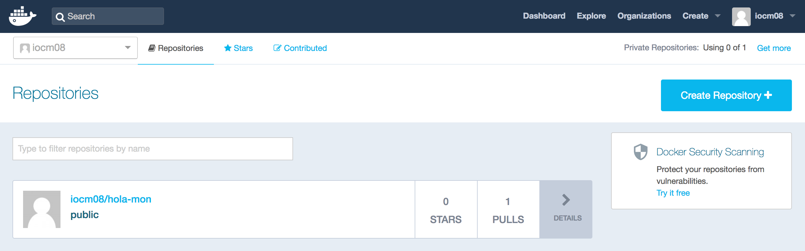 Si actualitzeu la pàgina web amb l’usuari autenticat a Docker Hub, veureu com ha aparegut el repositori “hola-mon”, tal com apareix a la figura).