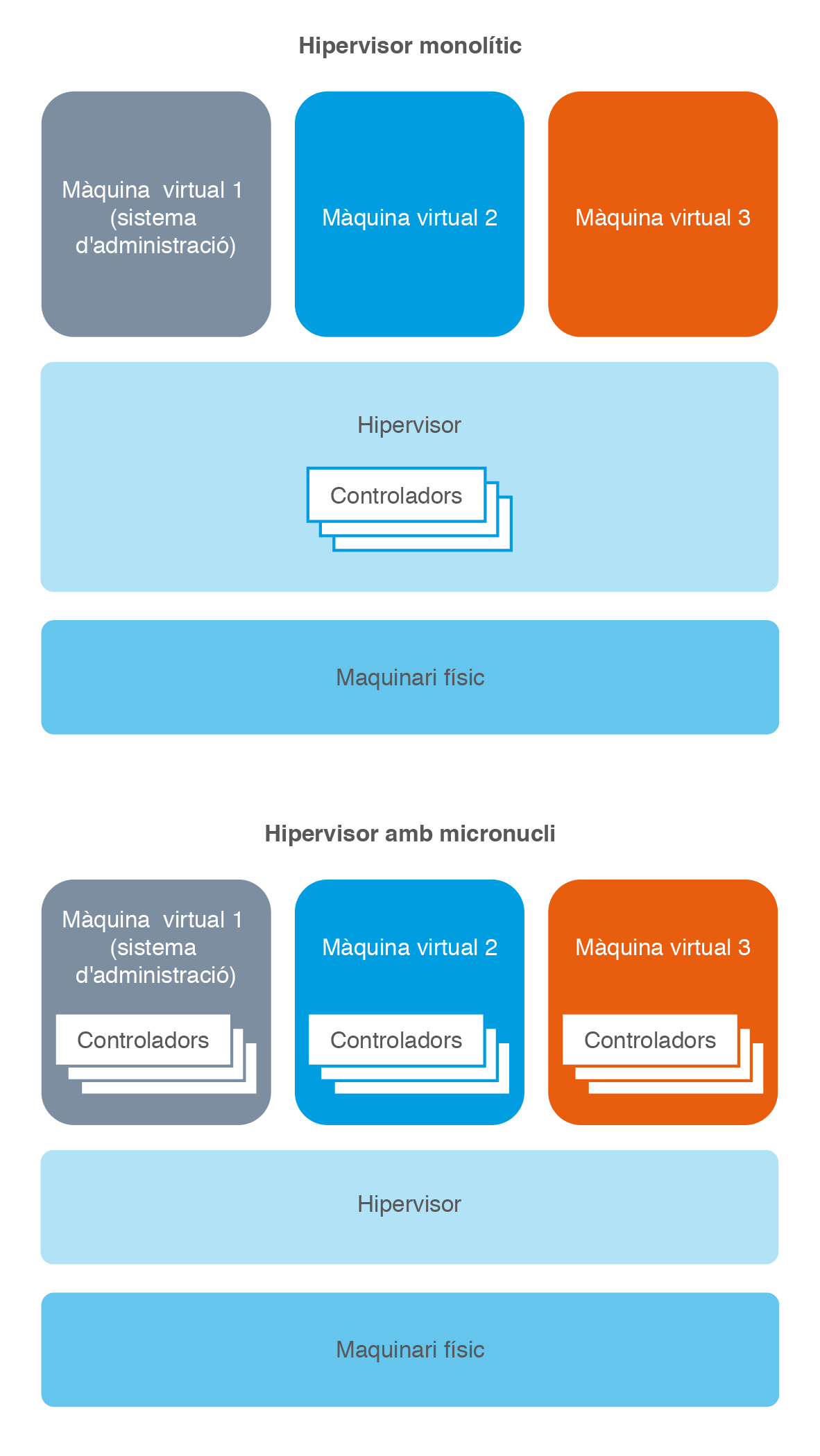 D’altra banda, depenent de l’arquitectura, l’hipervisor pot disposar o no dels controladors necessaris per a la gestió dels recursos de maquinari o bé pot ser el mateix sistema operatiu de la màquina virtual el que els té prèviament instal·lats. En la figura podem observar aquestes dues situacions.