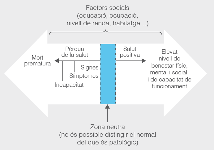 Dins d’aquest continu, hi ha una zona neutra que ens reflecteix que la separació entre malaltia i salut no és absoluta, de manera que hi ha situacions en què és difícil diferenciar la situació normal de la patològica. També cal recalcar que la mort arriba per imperatiu biològic, i que l’òptim de salut difícilment s’aconsegueix. A més, entre la zona neutra i els extrems hi ha diferents graus de pèrdua de salut i de salut positiva. Per això considerem el concepte de salut com un concepte dinàmic (vegeu la figura).