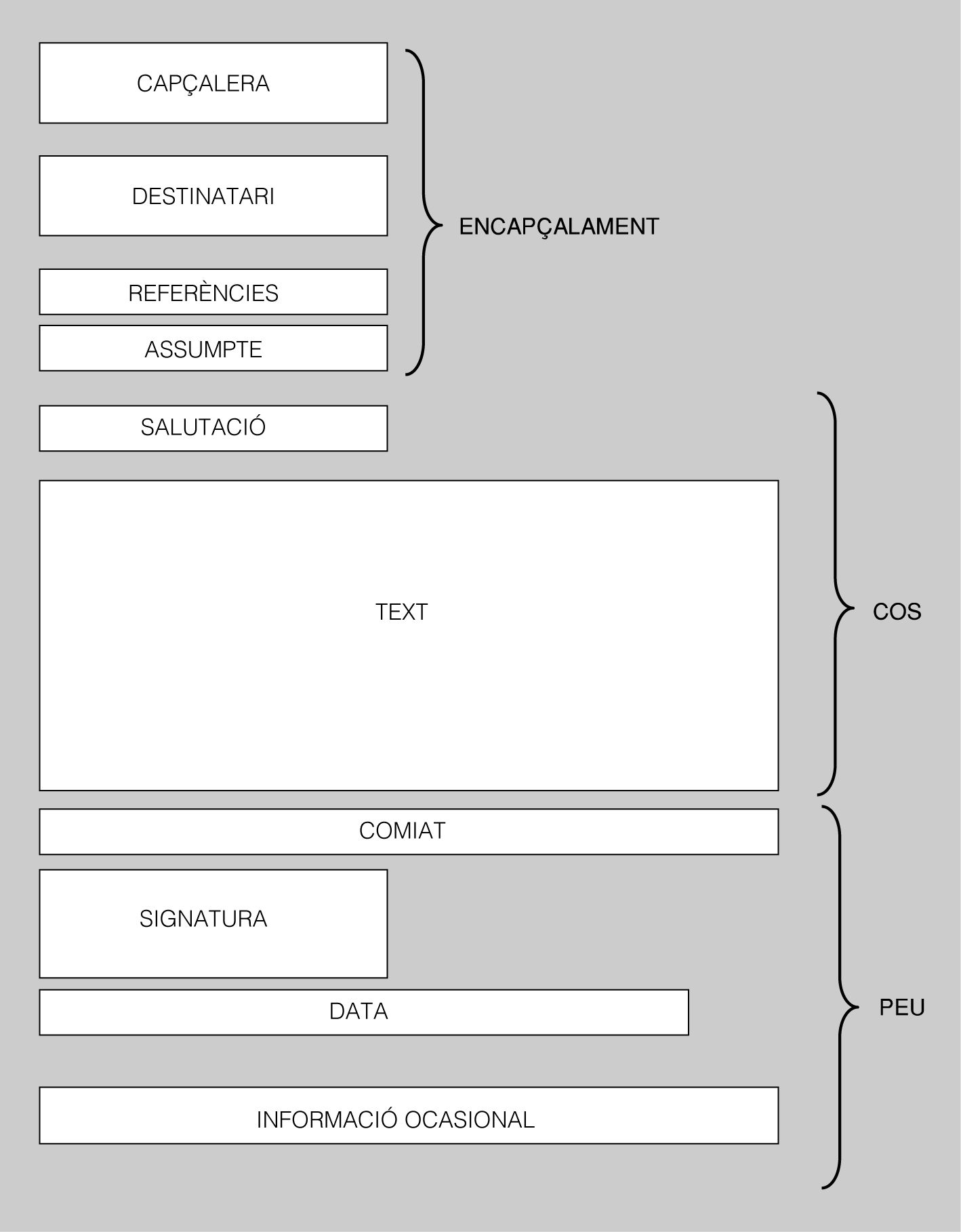 - En el peu hi tenim la fórmula de comiat, la signatura, la data (actualment és més habitual trobar-la al peu que a l’encapçalament) i les informacions addicionals, com ara els annexos.