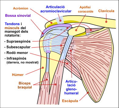 - Articulacions esfèriques o enartrosis: tenen forma de bola i receptacle, i es caracteritzen pel lliure moviment en qualsevol direcció, com per exemple el maluc i el muscle i l’espatlla (vegeu la figura).