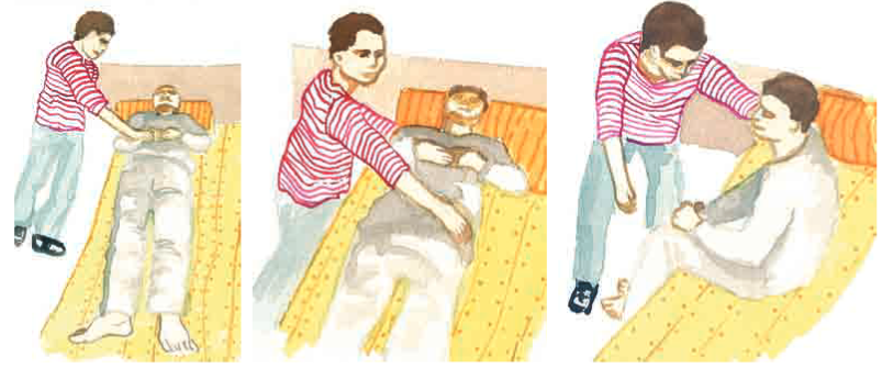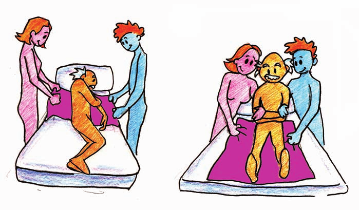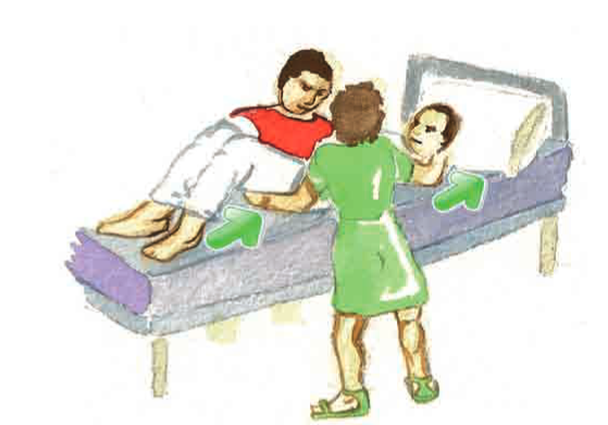 - Si el pacient té alguna de les extremitats més feble ha d’ajudar-se amb aquelles que té mes fortes i moure’s en la mesura del possible (vegeu la figura) .