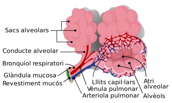 Els alvèols són les unitats funcionals d’intercanvi de gasos del pulmó. D’altra banda, la mucosa de les vies respiratòries està coberta per milions de pèls diminuts, o cilis, la funció dels quals és atrapar i eliminar les restes de pols i gèrmens en suspensió procedents de la respiració.