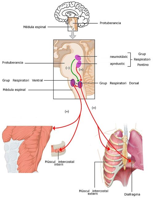 Quan es fa un esforç físic important, la freqüència respiratòria augmenta immediatament de forma involuntària. En repòs, un adult respira 14-20 vegades per minut, mentre que situacions d’exercici intens pot arribar a 60 respiracions per minut. El sistema de control de la respiració precisa de tres elements bàsics (vegeu la figura):