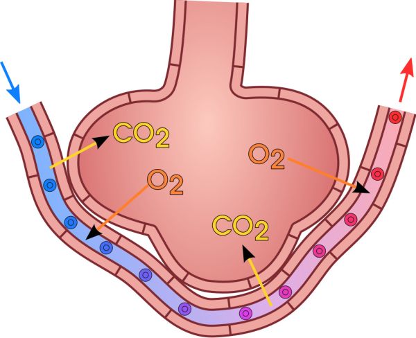 La funció dels pulmons és fer l’intercanvi gasós amb la sang; per això, els alvèols estan en estret contacte amb els capil·lars. En els alvèols es produeix el pas d’oxigen des de l’aire fins a la sang, i el pas de diòxid de carboni des de la sang cap a l’aire. Aquest pas es produeix per la diferència de pressions parcials d’oxigen i diòxid de carboni (difusió simple) entre la sang i els alvèols. Per tant, poden distingir tres parts en aquest procés: