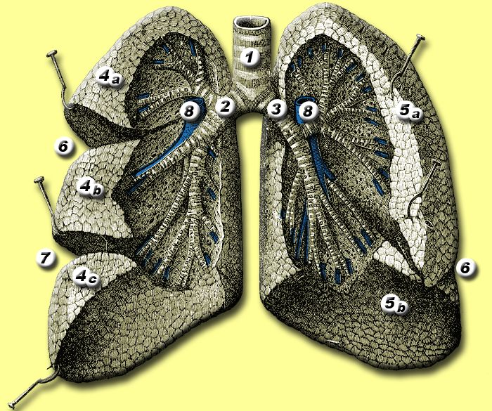 En la figura podeu veure, numerades, les parts fonamentals dels pulmons: