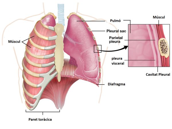 - La pleura parietal o externa, que recobreix i s’adhereix al diafragma i a la part interior de la caixa toràcica.