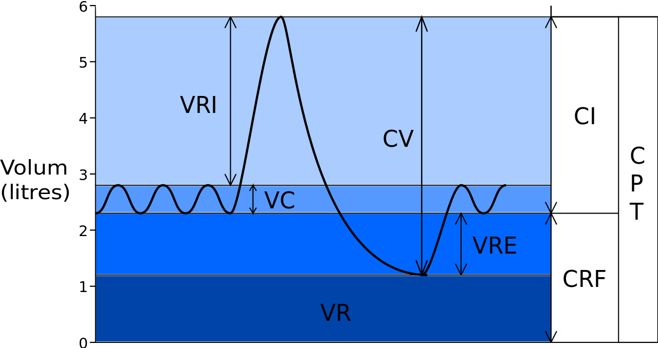 - Capacitat inspiratòria (CI): volum d’aire que una persona pot respirar començant en el nivell d’una expiració normal i distenent al màxim els seus pulmons (3500 ml aprox.). La fórmula és la següent: CI = VC + VRI.