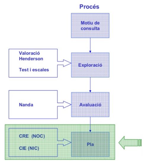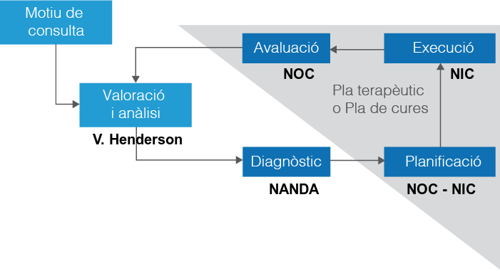 Per aplicar el mètode científic, es recomana utilitzar aquestes classificacions i les respectives etiquetes objectives proposades. A la figura podeu veure la correspondència de les taxonomies NANDA, NIC, NOC dins de les cinc fases del procés d’atenció d’infermeria (PAI).